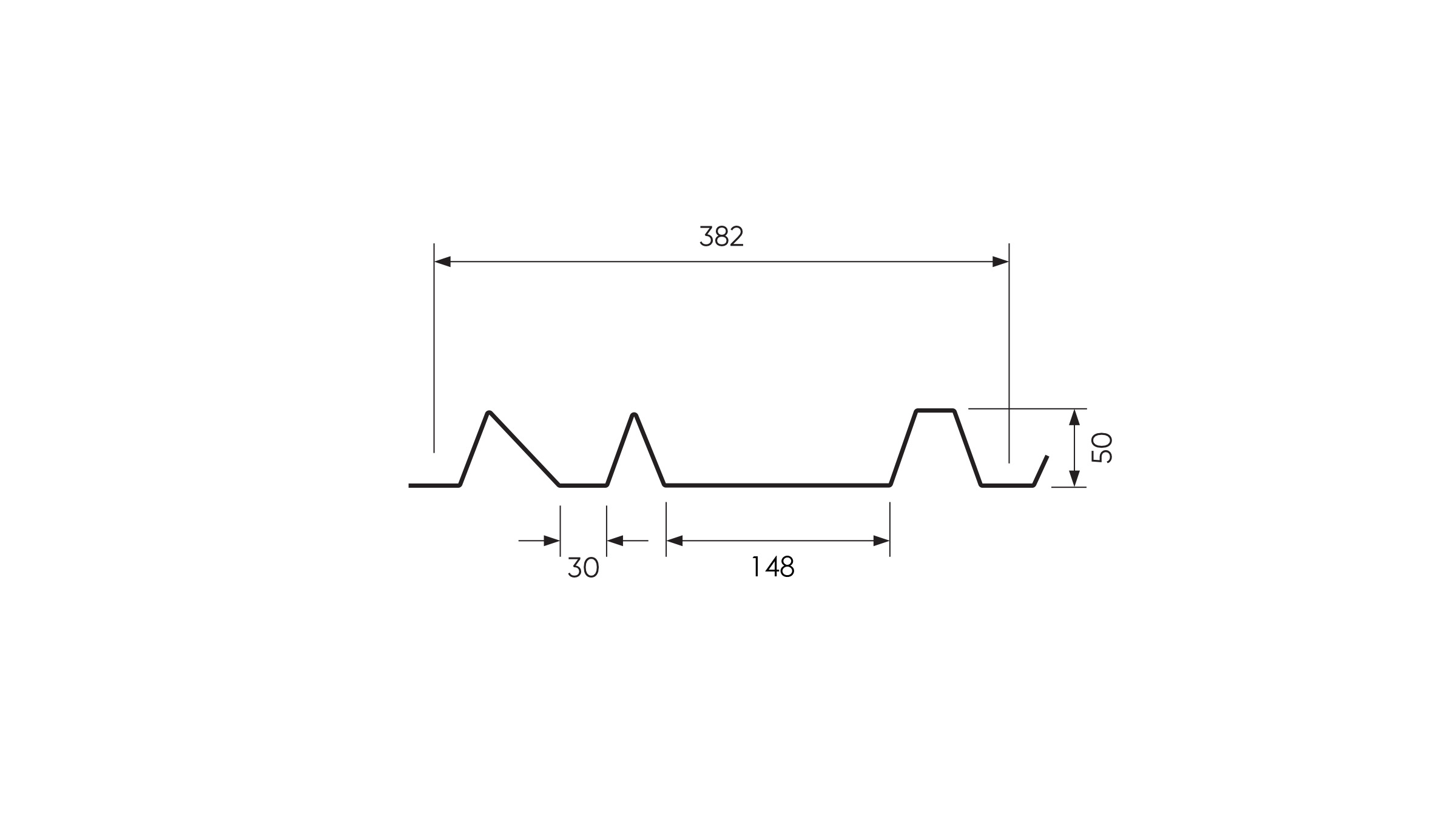 ENTROPÍA V2 architectural metal profile (3.127.50) from Europerfil. Nerve height 50 mm, useful width 382 mm, and thickness from 0.60 mm to 1.20 mm. Galvanised and pre-lacquered steel (EN 10169) in standard Europerfil colours and coatings. CE marking (EN 14782). Auxiliary complements: Application perforation for lighting and natural ventilation.