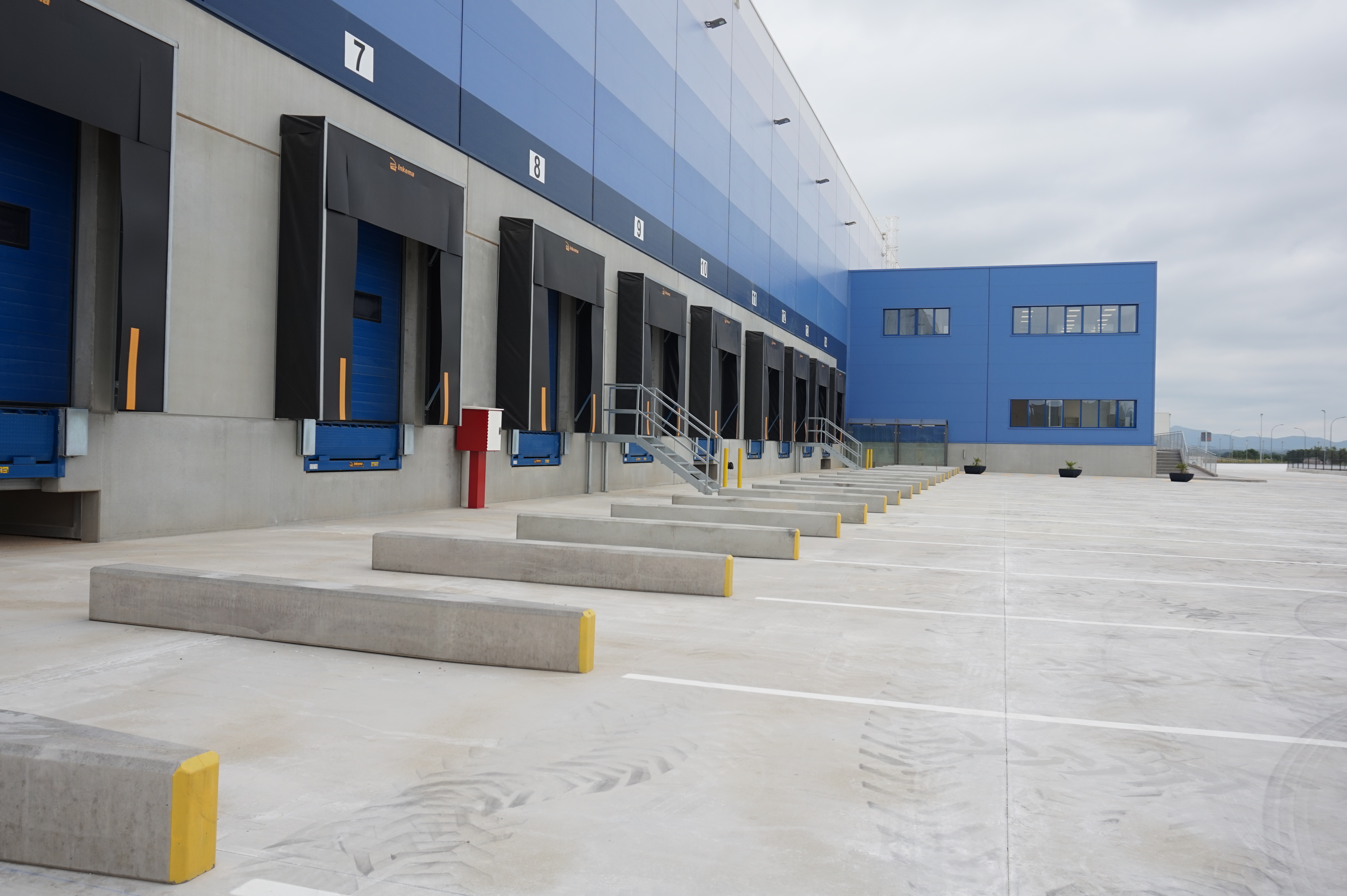 Fachada compuesta por: panel sandwich metálico Nilho formando un degradado de azules y perfil Eurobase 48