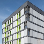 Perfil metálico Keops en color Gris RAL 9007 y en perforado R3T6 en color Gris RAL 9006, todo en revestimiento Esmeralda Plus. | Arquitectura: Riba Arquitectes.