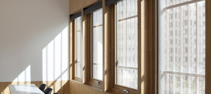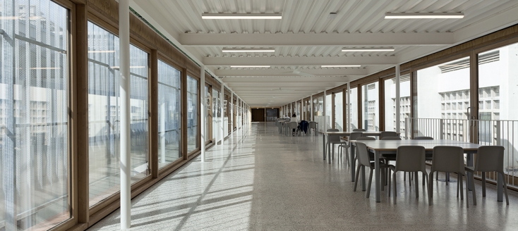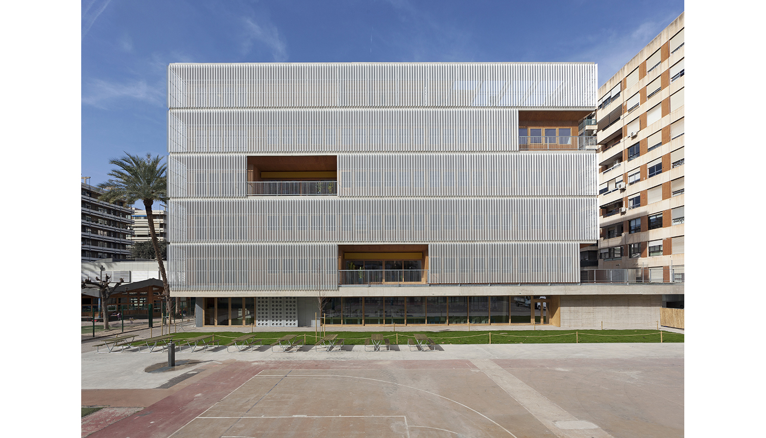 Ampliació del Col·legi Alemany de València (Fase 1). Consta d'un nou edifici per educació secundària i una galeria de connexió amb l'edifici principal. El perfil metàl·lic de la façana és un perfil nervat amb forma piramidal de gran cantell en alumini perforat i post anoditzat, creat per Orts&Trullenque i fabricat ad-hoc per aquest projecte. | Materials: Perfil realitzat a mida en alumini perforat R10T14, amb tractament post anoditzat. Perfil Eurocol 60 de forjat col·laborant i Perfil Haircol 59 sense emboticions per encofrat perdut, prelacat en color blanc per la cara vista. | Arquitectura: Orts&Trullenque | Fotografia: ©Diego Opazo